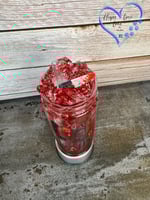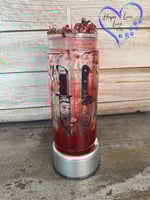 This is a unique snow globe style tumbler filled with colored fluid to create a blood drip in the double walled acrylic tumbler.